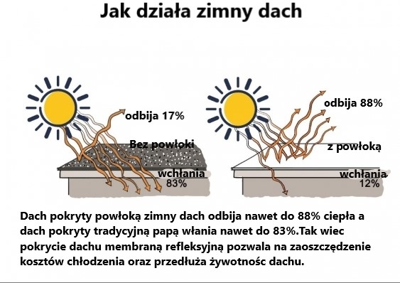 - W Polsce najczęściej wybieranym rozwiązaniem, głównie przez niską cenę, jest papa. Ciemne pokrycia natomiast pochłaniają promieniowanie słoneczne, co powoduje nagrzewanie się dachu, a w konsekwencji – wzrost temperatury wewnątrz pomieszczeń. Dach pokryty białą żywicą natomiast odbija promieniowanie słoneczne, zmniejszając ilość ciepła, które przenika do środka, co pomaga w obniżeniu temperatury wewnątrz budynku podczas upałów – tłumaczy.